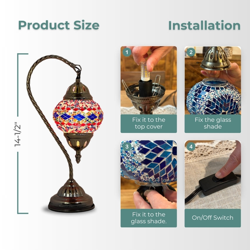 Experience the captivating allure and vibrant energy of the Turkish Lamp with Blue & Red Diamond Patterns - Swan Neck Elegance. This handcrafted masterpiece is more than just a lamp; it's a work of art that transforms your space with its dazzling geometric patterns, graceful design, and the timeless beauty of Turkish mosaic craftsmanship.