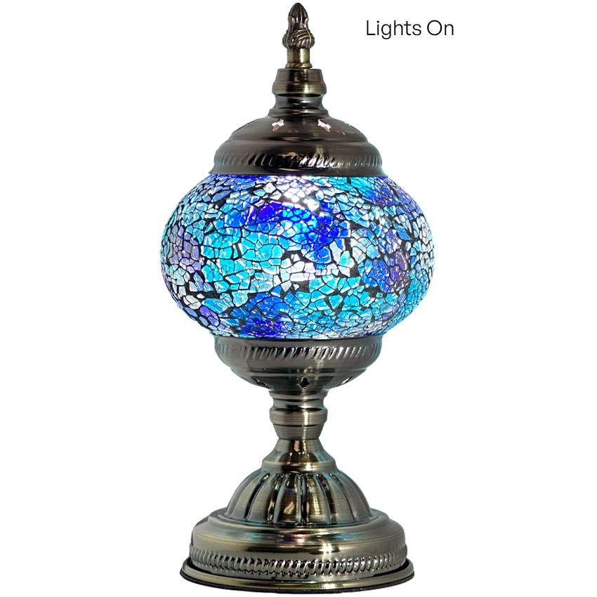 Experience the captivating allure of the Blue Lavender Skies Handmade Mosaic Glass Lamp. This exquisite round lamp is a testament to the artistry of handcrafted mosaic design, featuring a mesmerizing pattern of blues, light blues, dark blues, navy blues, turquoise, and white. Its intricate details and warm, inviting glow create a sense of tranquility and serenity, perfect for adding a touch of calming elegance to your home decor.