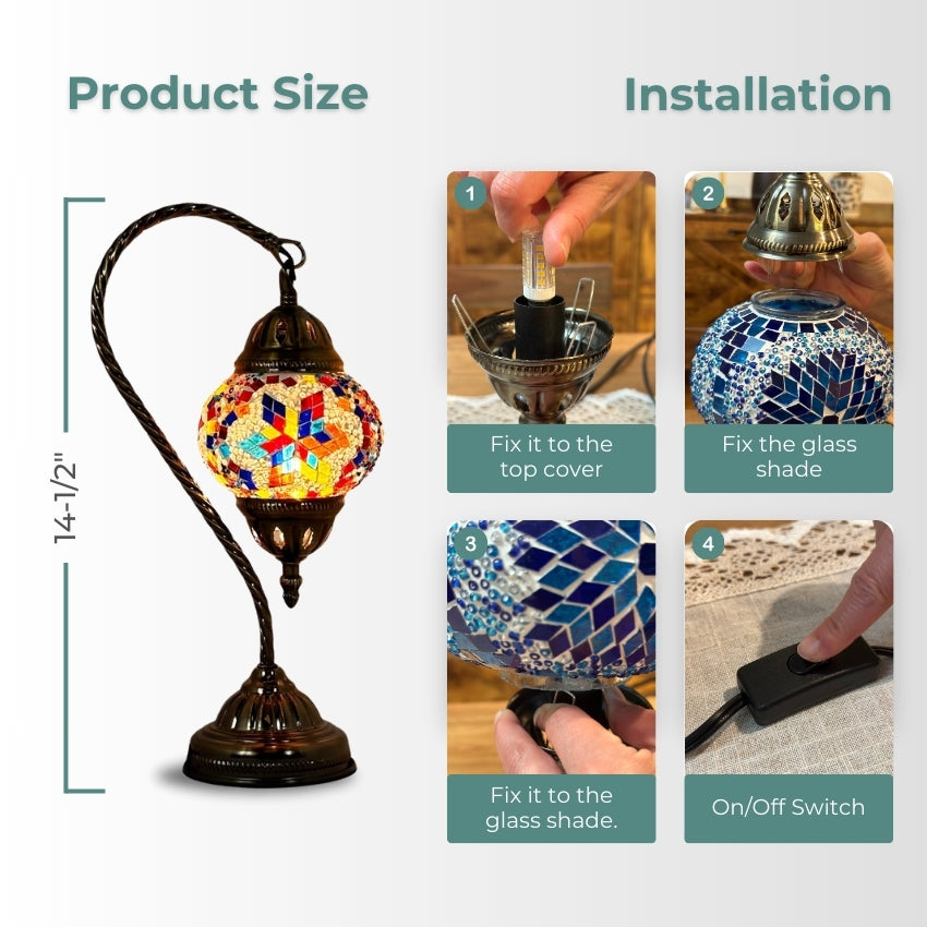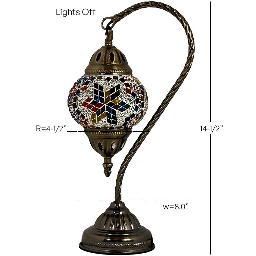 Let the Moroccan Essence of the Rainbow Petal Flower Swan Neck Handmade Mosaic Glass Lamp illuminate your home. Order yours today and experience the magic of handcrafted mosaic art.