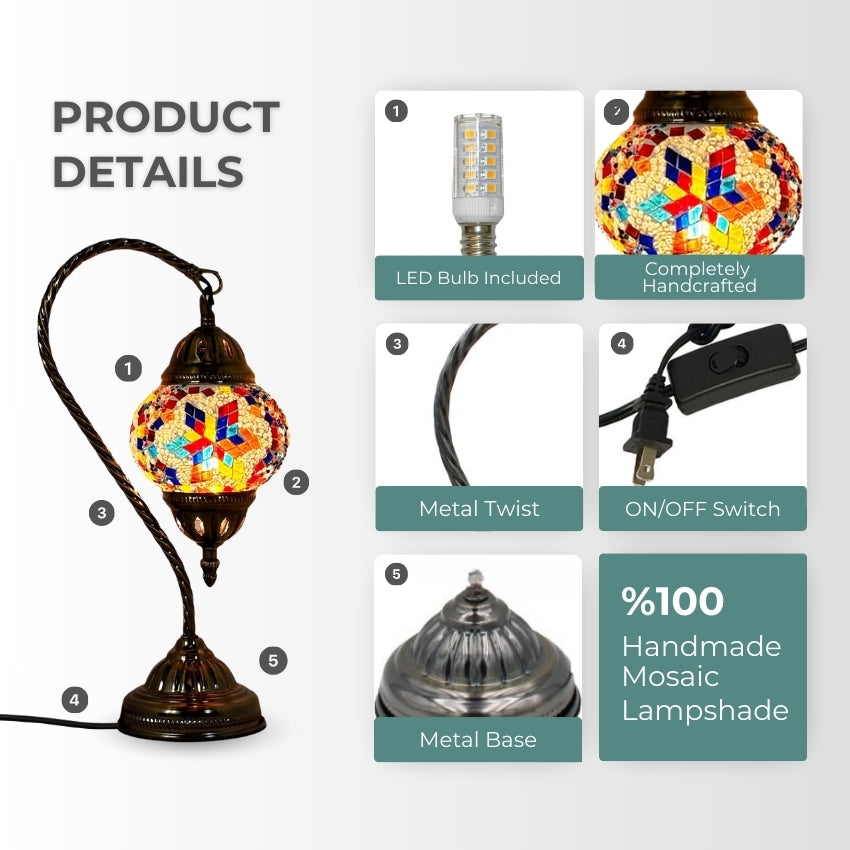 The graceful swan neck design adds a touch of elegance and sophistication, while the playful rainbow colors create a sense of whimsy and joy. Whether placed in your living room, bedroom, or any space seeking a touch of Moroccan inspiration, this lamp is sure to become a cherished centerpiece.