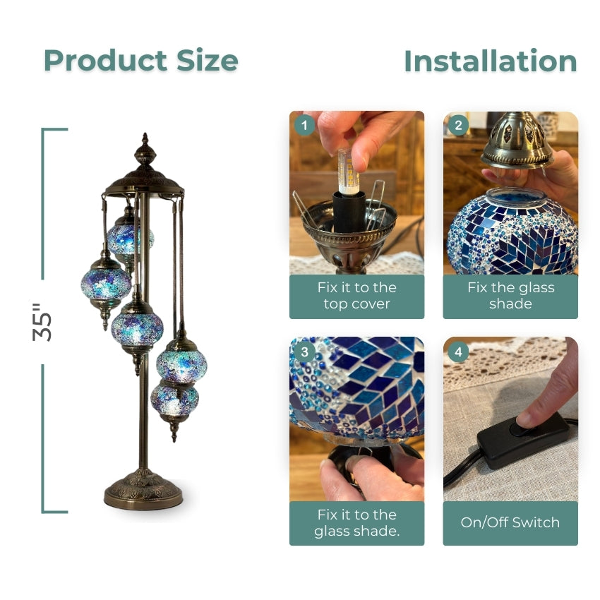 Experience the magic of the cosmos with the Deep Sea Blue Turkish Lamp. This handcrafted masterpiece features five globes adorned with a mesmerizing deep sea blue mosaic design, casting a warm and inviting glow that transforms any room into a luxurious sanctuary.