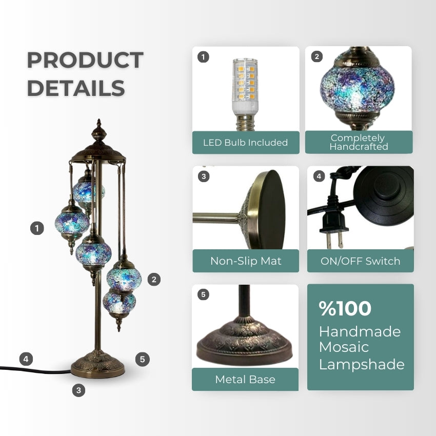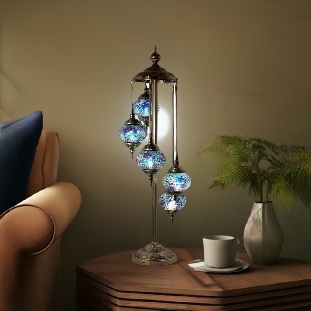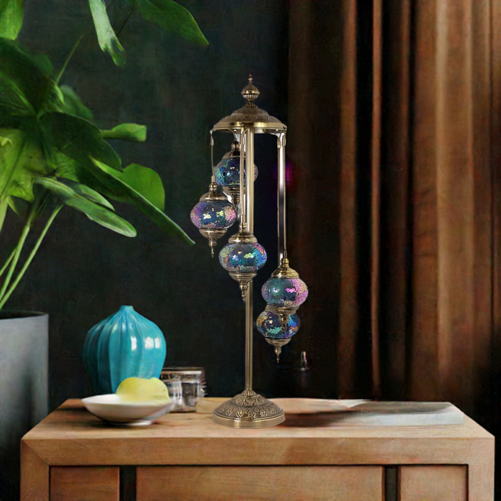 Deep Sea Blue Turkish Lamp with Quintuple Mosaic Globes