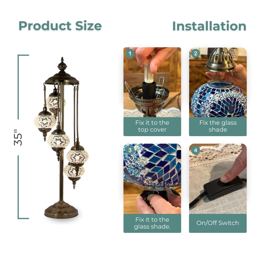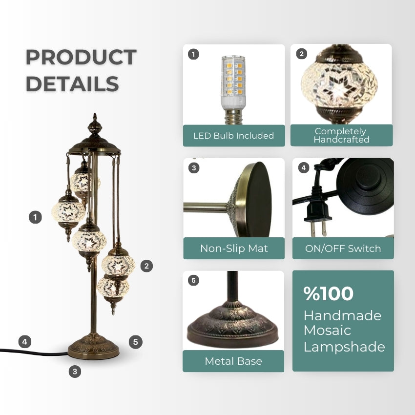 Let the Lunar Glow illuminate your home with its celestial beauty and handcrafted charm. Order your Handmade Turkish Lamp with Quintuple Globes today and experience the magic of mosaic art.
