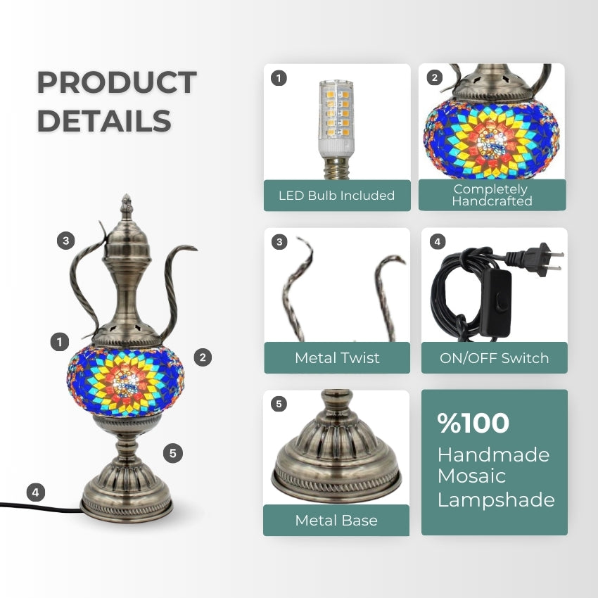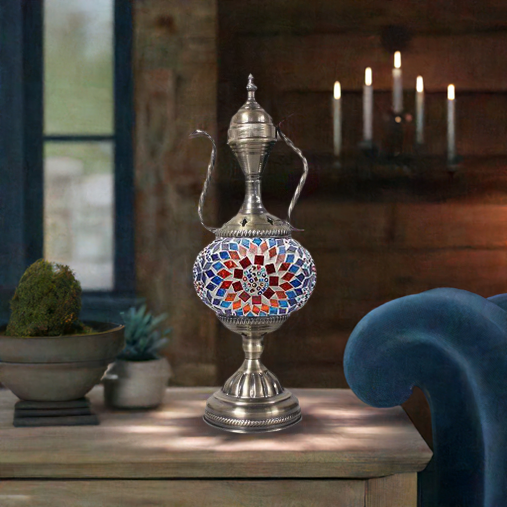 Transport your home to the vibrant bazaars of Turkey with the Artistic Blue Sunflower lamp. This exquisite piece, handcrafted with intricate mosaic glass, features a captivating blue and white floral design inspired by traditional Turkish motifs.