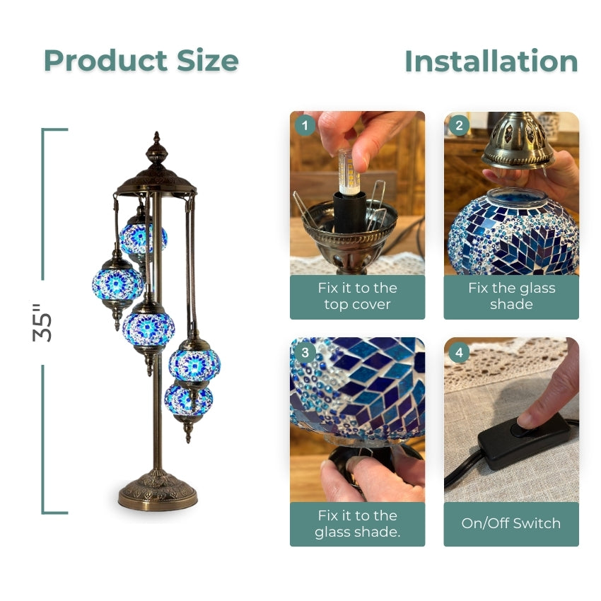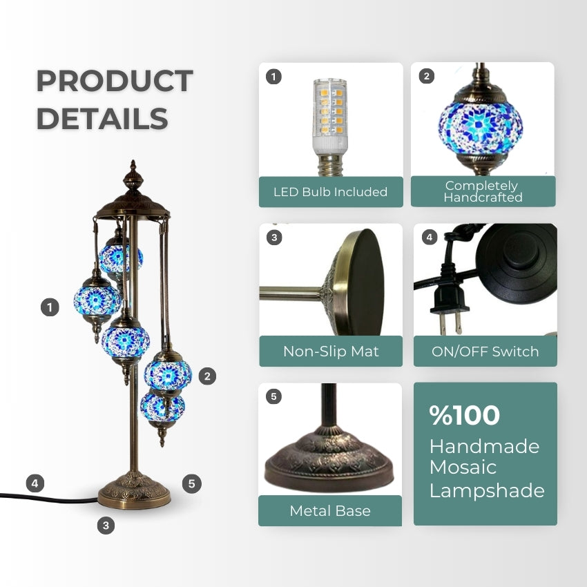 Embrace the tranquility of Oceanic Dreams: Ethereal Turkish Lamp with 5 Mosaic Globes. Order yours today and experience the magic of handcrafted mosaic art.