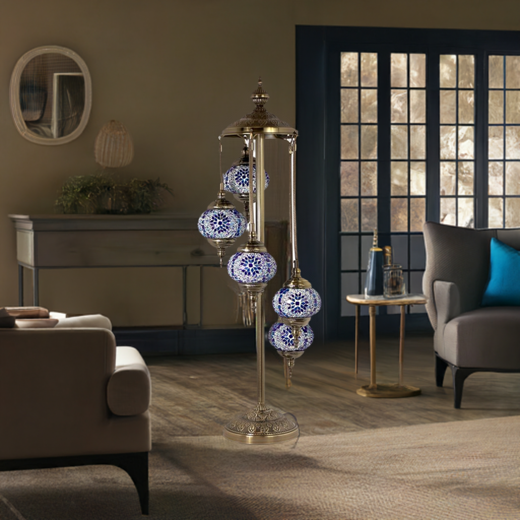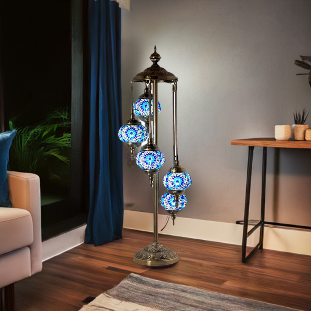 Oceanic Dreams: Ethereal Turkish Lamp with 5 Mosaic Globes