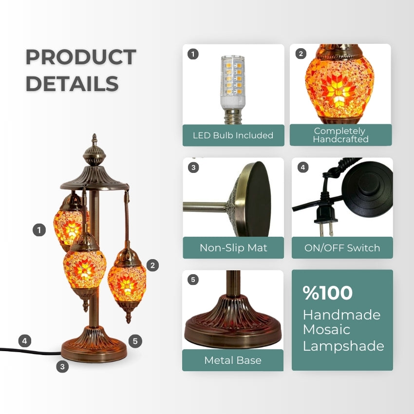 Embrace the exquisite beauty of Turkish design with the Orange Blossom lamp. This handcrafted mosaic masterpiece features a unique egg-shaped design adorned with an intricate orange blossom pattern and three illuminating globes, creating a statement piece that adds a touch of luxury and cultural richness to any space.