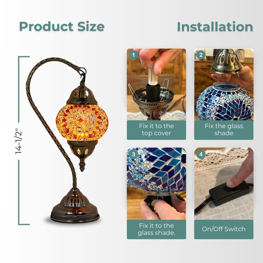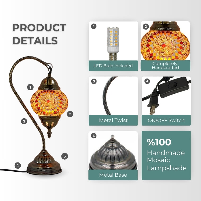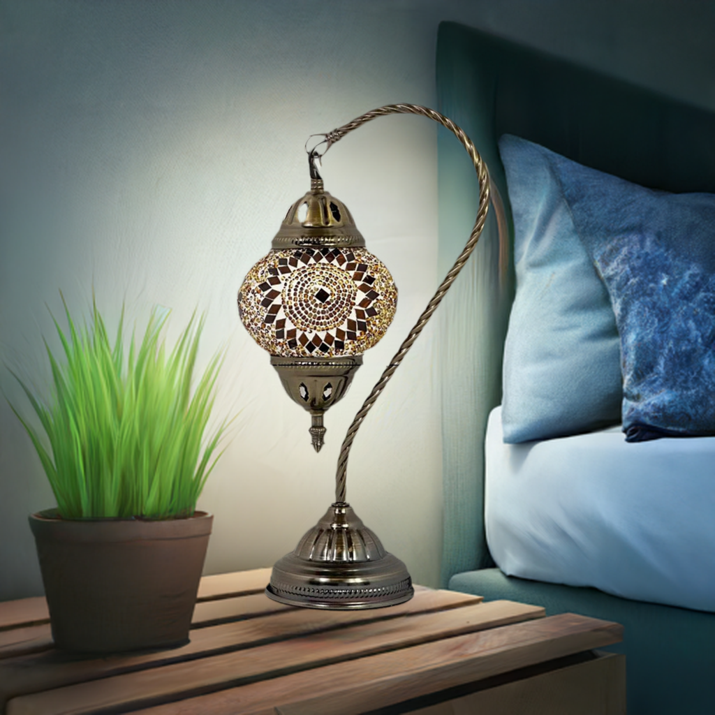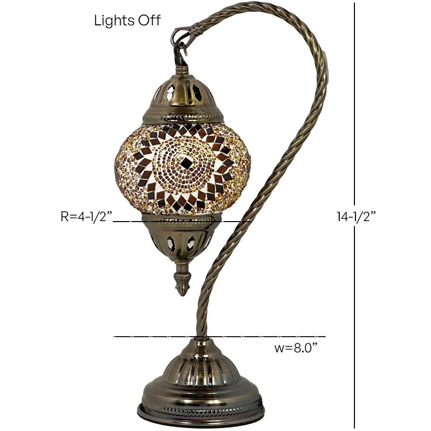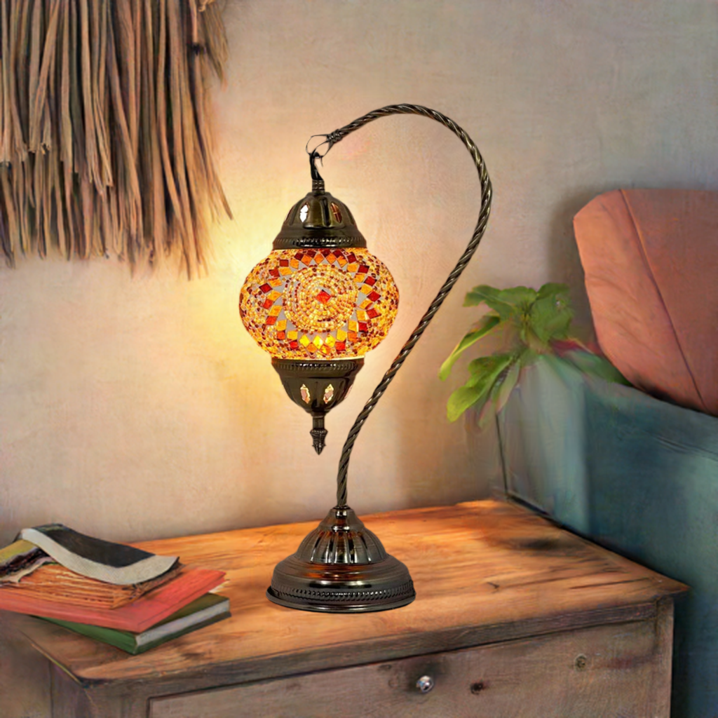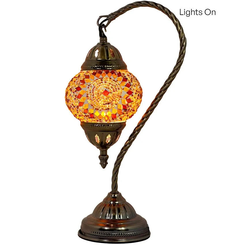 The graceful swan neck design adds a touch of elegance and sophistication, while the warm orange hues evoke a sense of exotic charm and cultural richness. Whether placed in your living room, bedroom, or any space seeking a touch of Moroccan inspiration, this lamp is sure to become a cherished centerpiece.