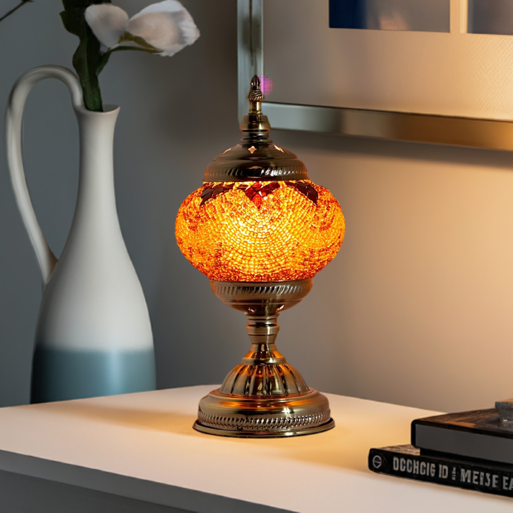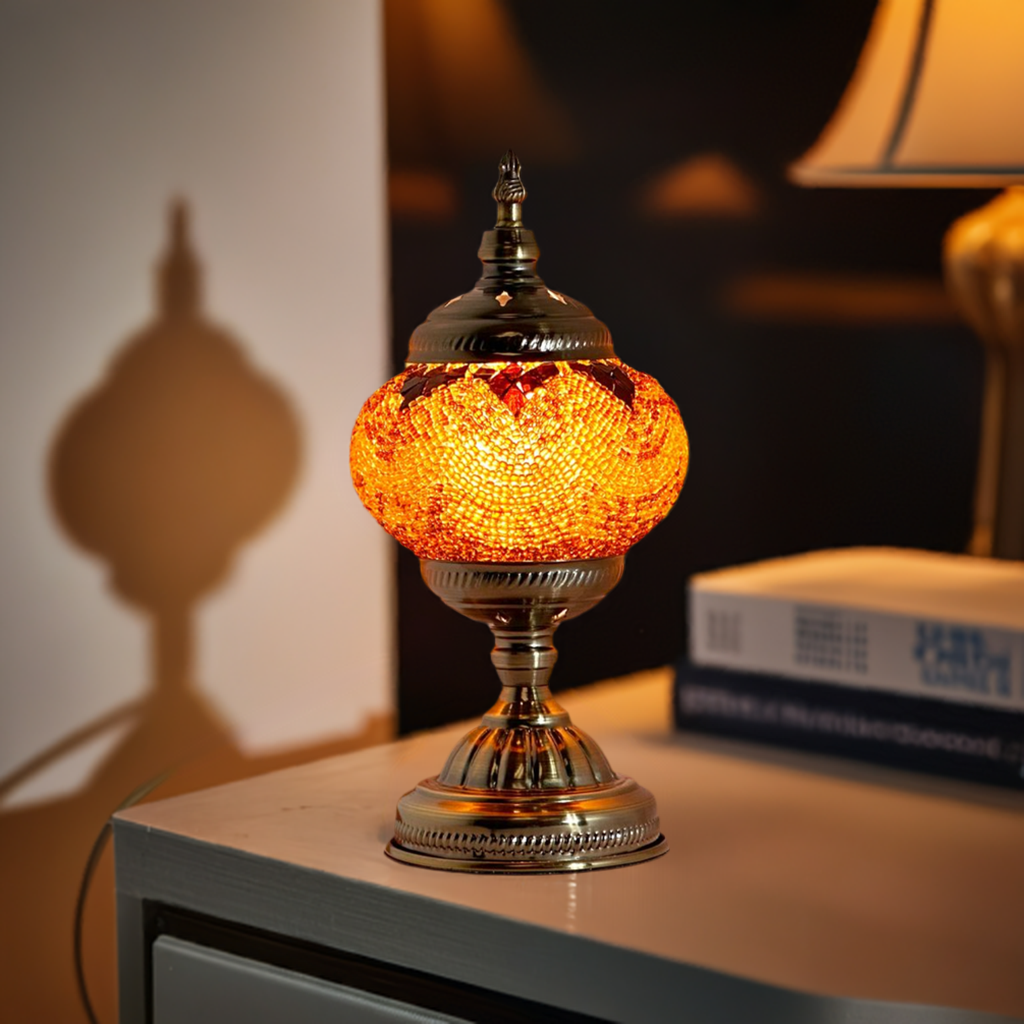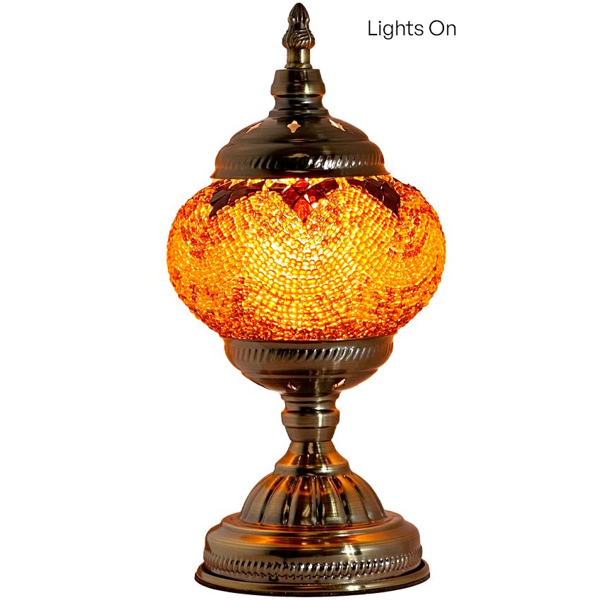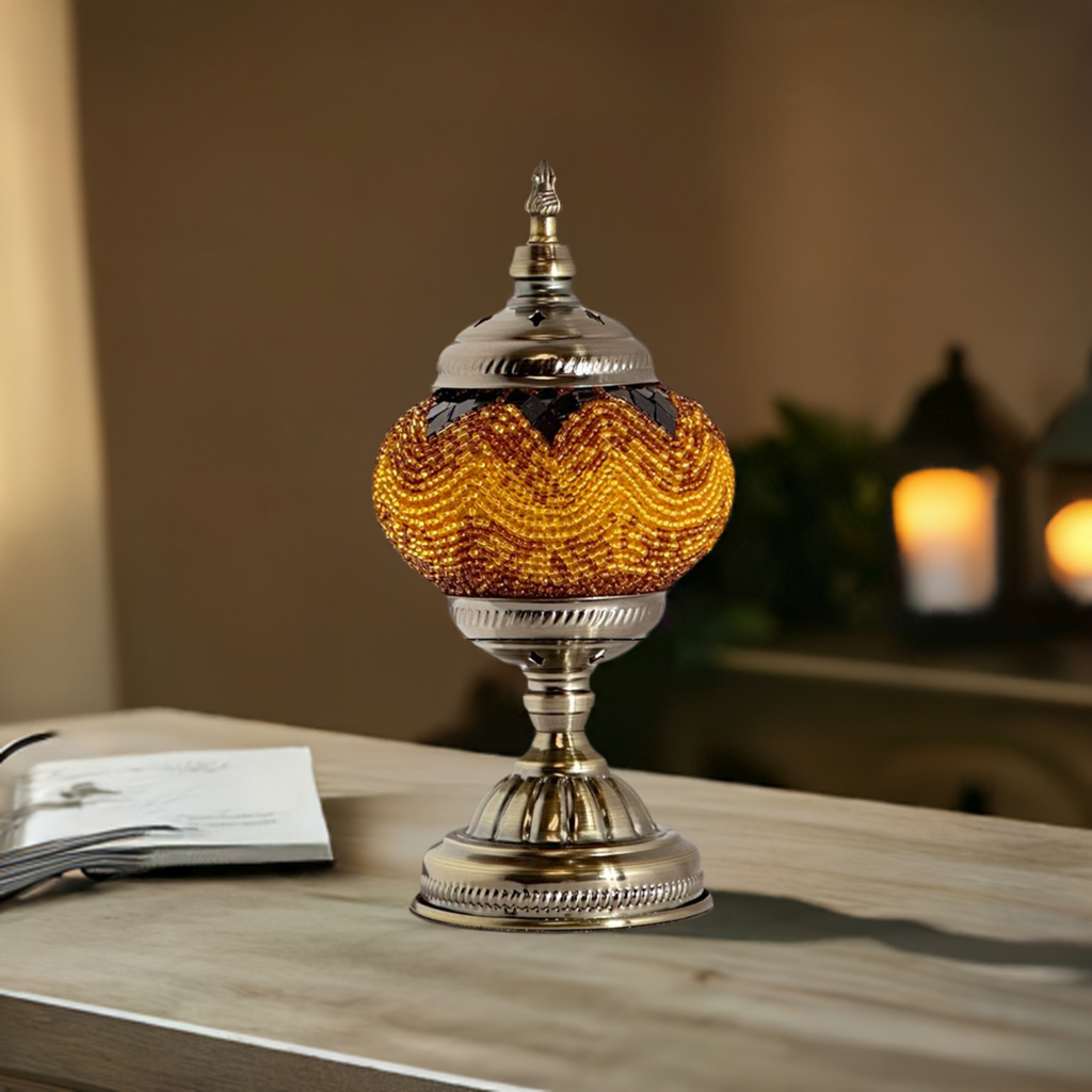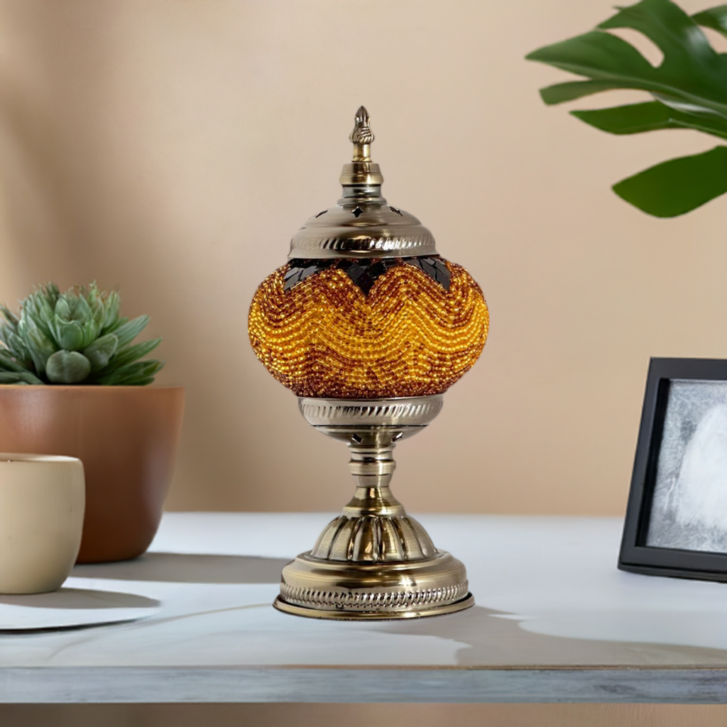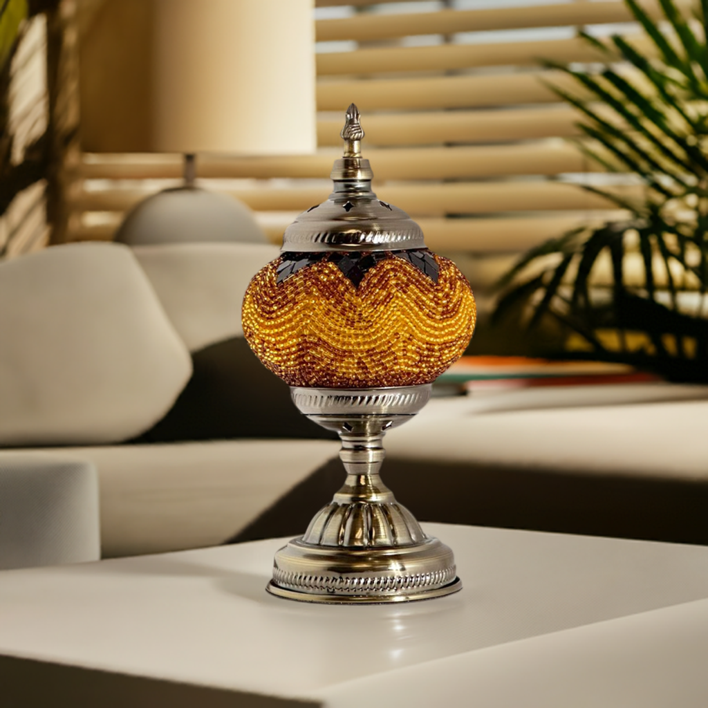 Experience the captivating allure of the desert with the Desert Mirage Lamp. Inspired by the iconic Tiffany-style, this handcrafted Turkish lamp features a mesmerizing golden sandstorm pattern, casting a warm and inviting glow that transforms any space into an oasis of elegance.